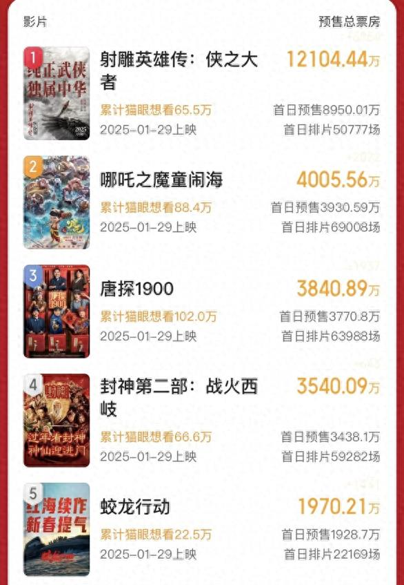 今年的春节档,新片《射雕英雄传:侠之大者》凭借1.2亿的预售票房暂居第一,显示了强大的市场吸引力。这部影片的成功不仅依赖于其经典IP的影响力,也得益于观众对武侠题材的浓厚兴趣。与此同时,另一部热门影片《哪吒之魔童闹海》以4000万的预售成绩位居第二,证明了动画电影在春节档中的独特魅力。